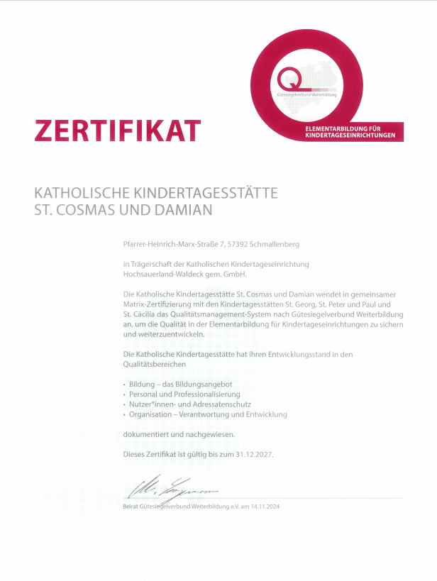 Qualität ist für uns die Grundlage unserer pädagogischen Arbeit. Damit wir die Kinder bestmöglich in ihrer Entwicklung begleiten können, überprüfen und entwickeln wir unsere Arbeit regelmäßig weiter. Im Jahr 2025 haben wir uns durch das QEK (Qualitätsmanagement- Modell- Elementarbildung) als Einrichtung zertifiziert.