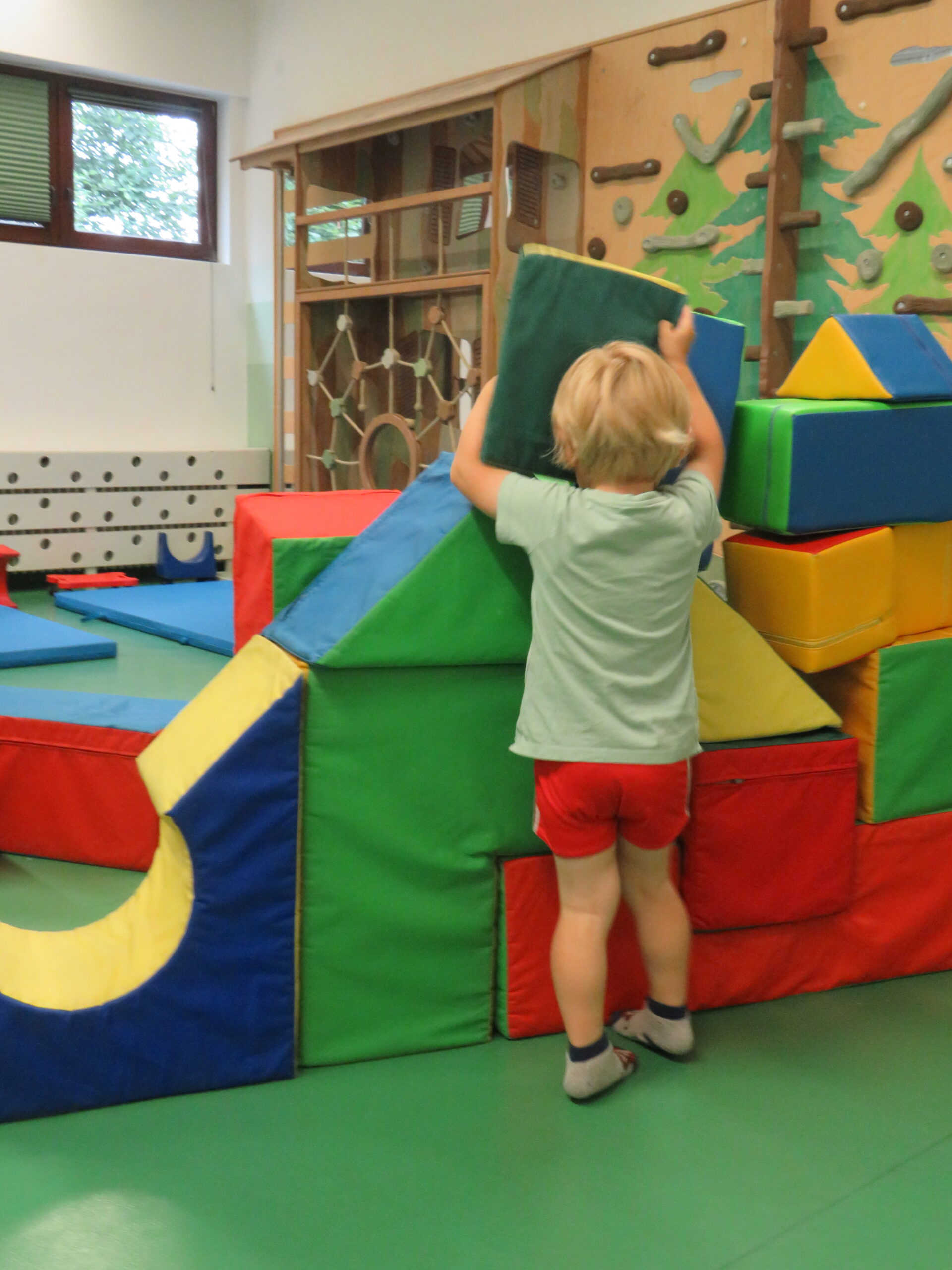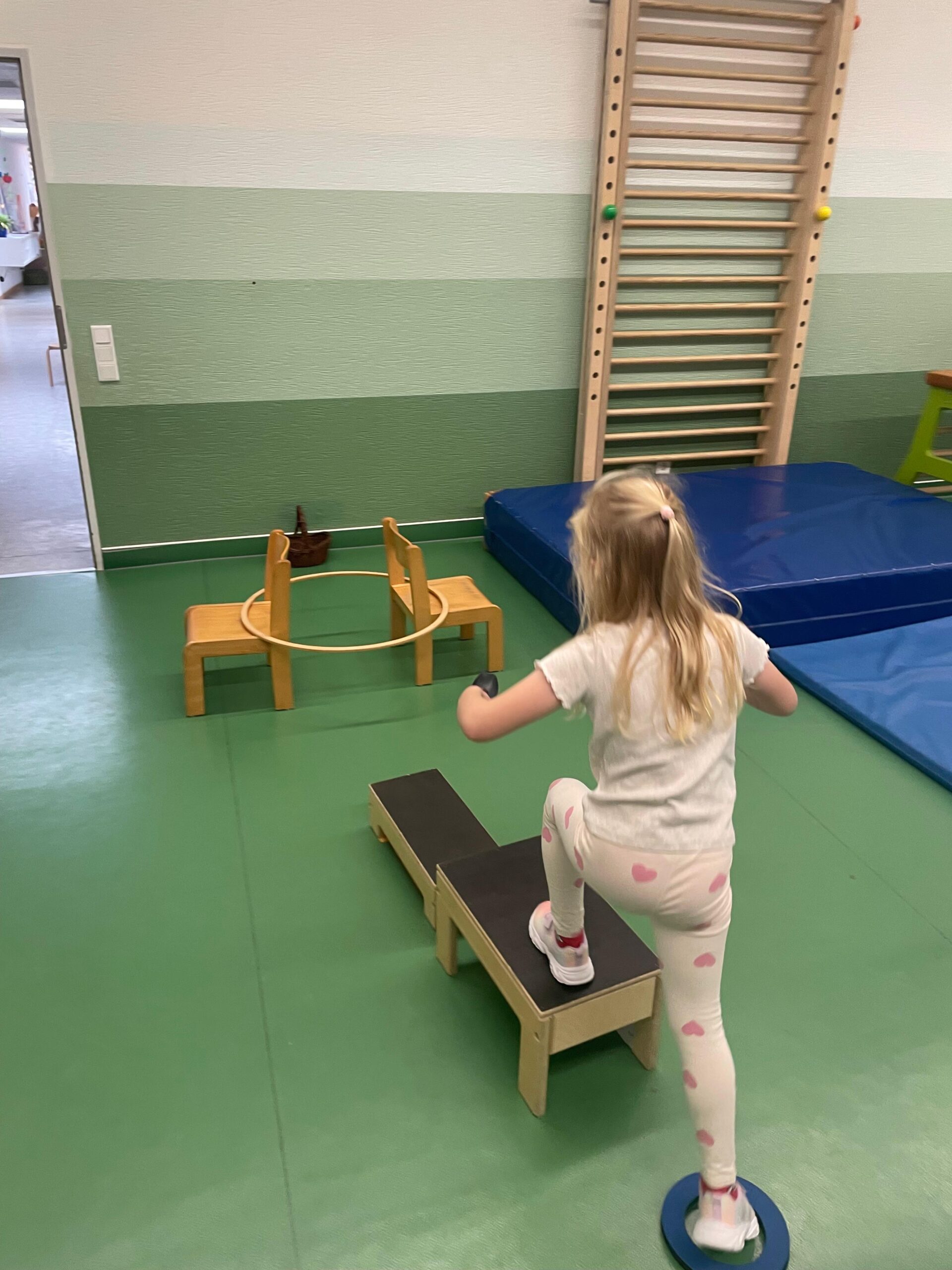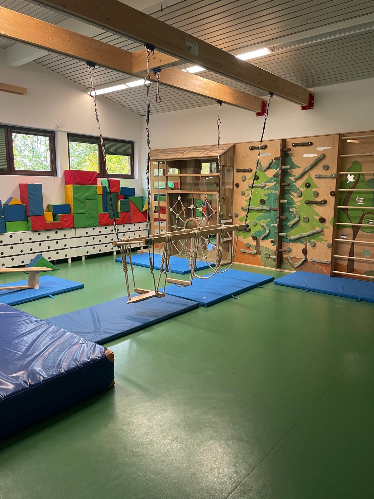 In unserem Turnraum entstehen regelmäßig spannende Bewegungslandschaften, die zum Klettern, Balancieren und Ausprobieren einladen. Unterschiedliche Materialien und Geräte wie Kletterwände, Sprossenwand oder Aufhängungen unter der Decke sorgen für abwechslungsreiche Bewegungserfahrungen. Hier finden auch gezielte Turnangebote und Bewegungsspiele statt.