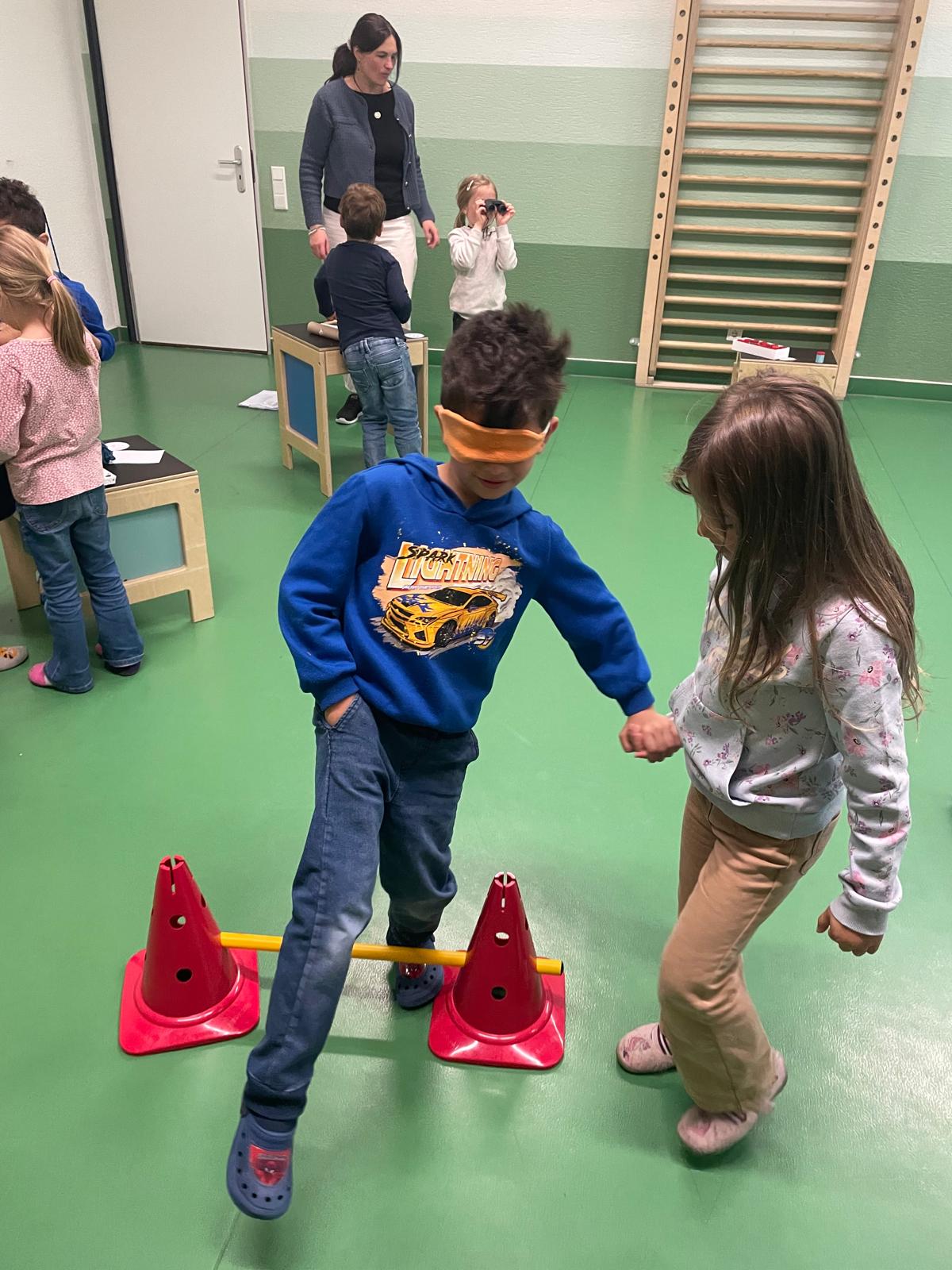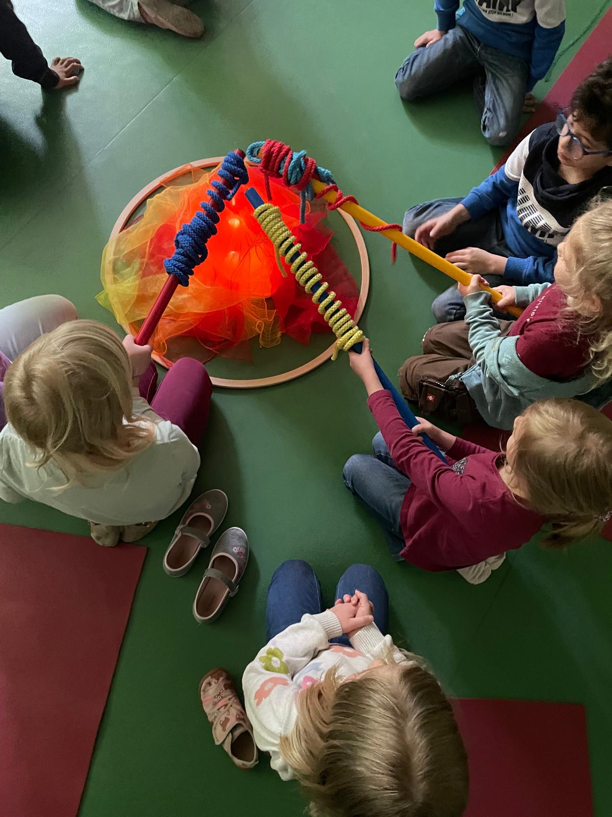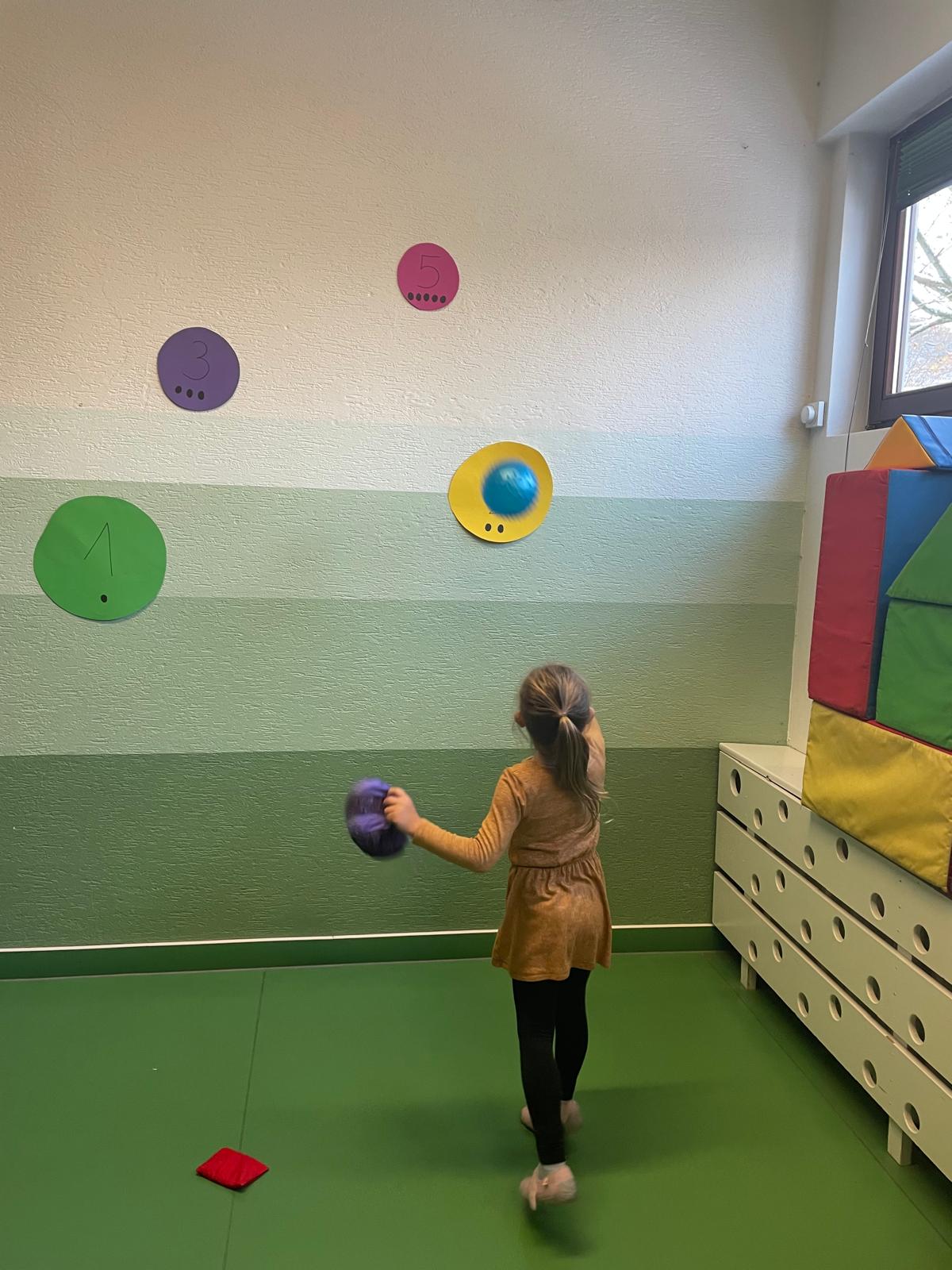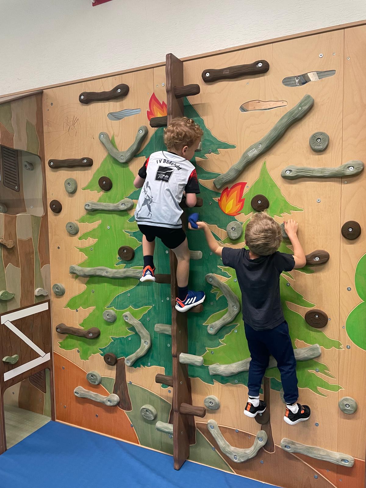 In unserem Turnraum entstehen regelmäßig spannende Bewegungslandschaften, die zum Klettern, Balancieren und Ausprobieren einladen. Unterschiedliche Materialien und Geräte wie Kletterwände, Sprossenwand oder Aufhängungen unter der Decke sorgen für abwechslungsreiche Bewegungserfahrungen. Hier finden auch gezielte Turnangebote und Bewegungsspiele statt.