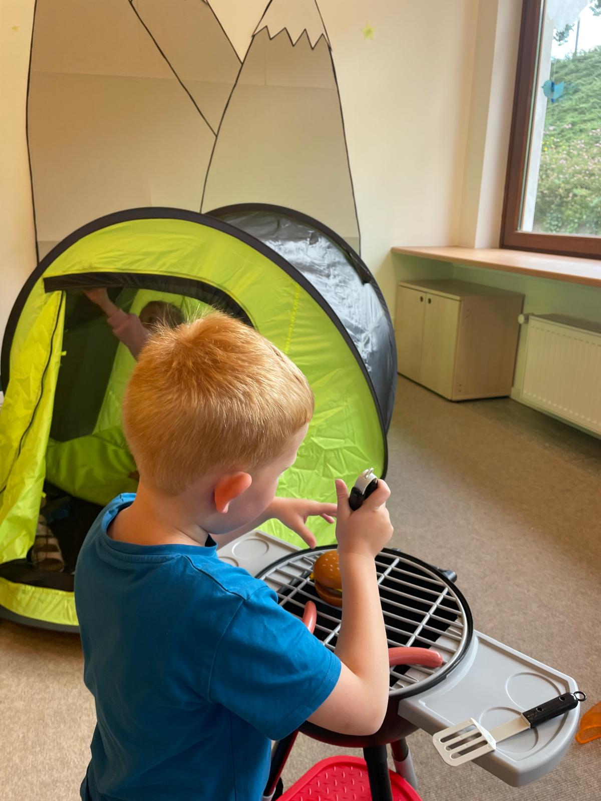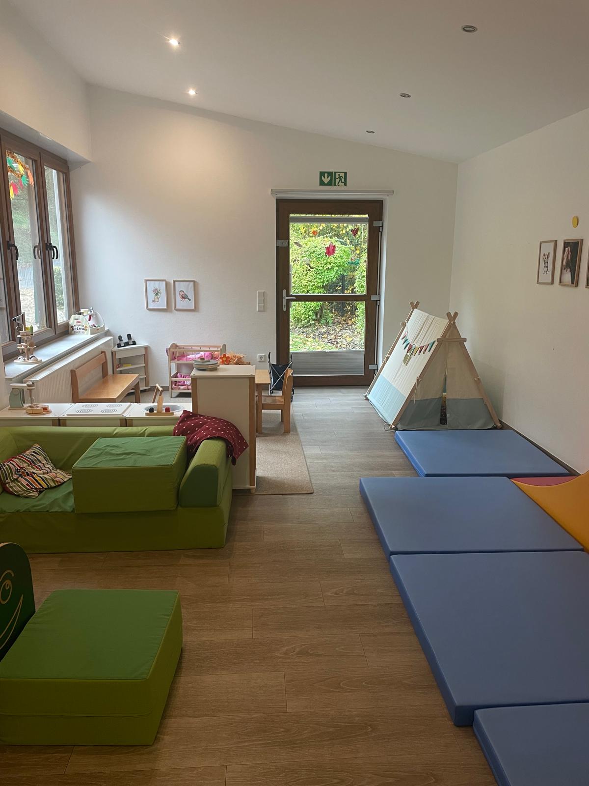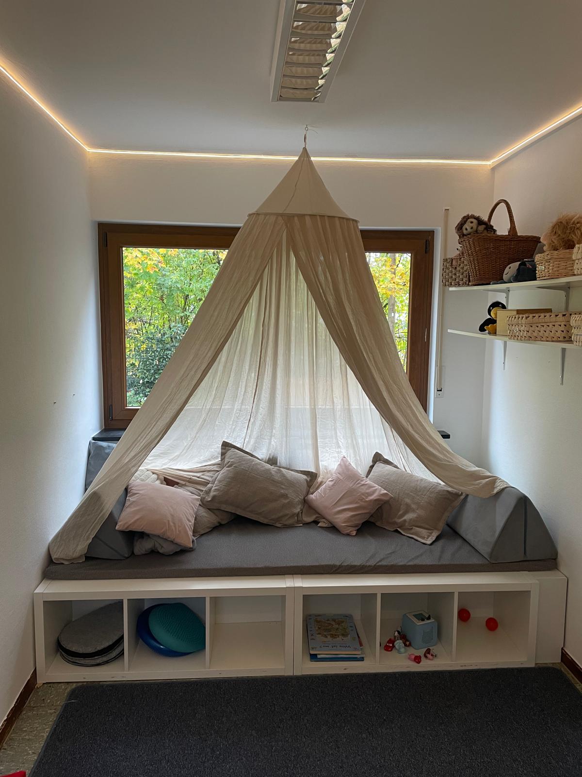 Der Ruheraum bietet den Kindern einen Rückzugsort zum Entspannen und Wohlfühlen. Hier können sie Hörgeschichten mit der Toniebox hören, sich gegenseitig mit Massagebällen massieren oder einfach auf der gemütlichen Liegefläche ausruhen. Bücher und eine ruhige Atmosphäre laden zum Abschalten und Träumen ein.