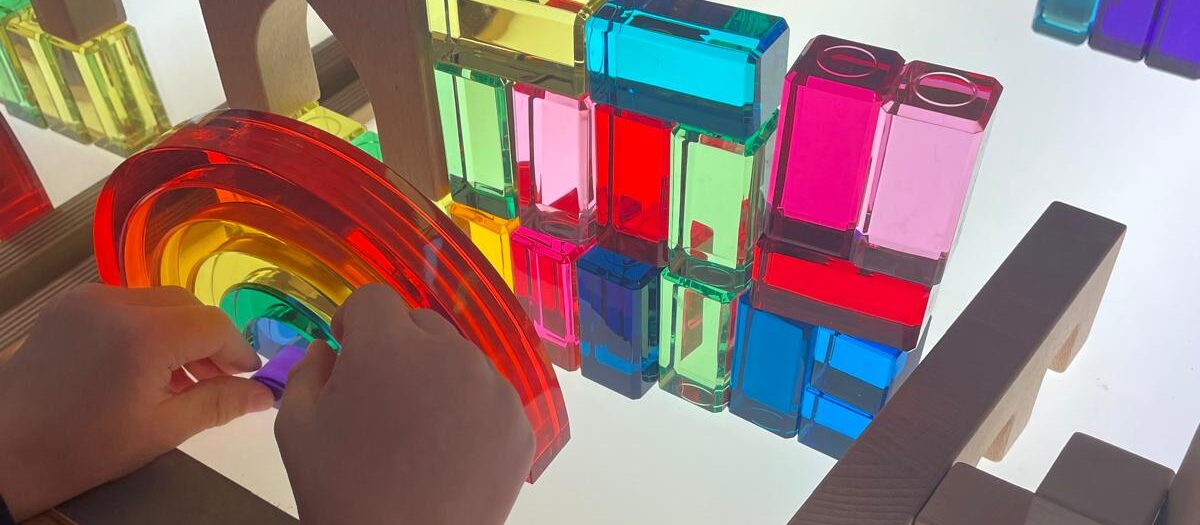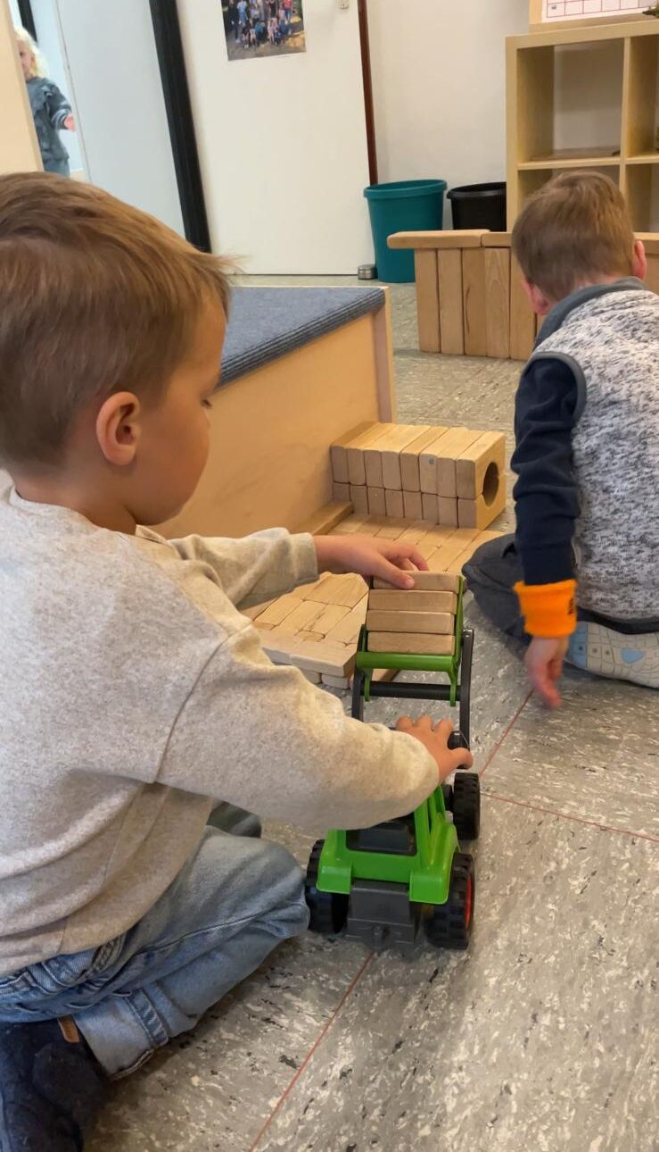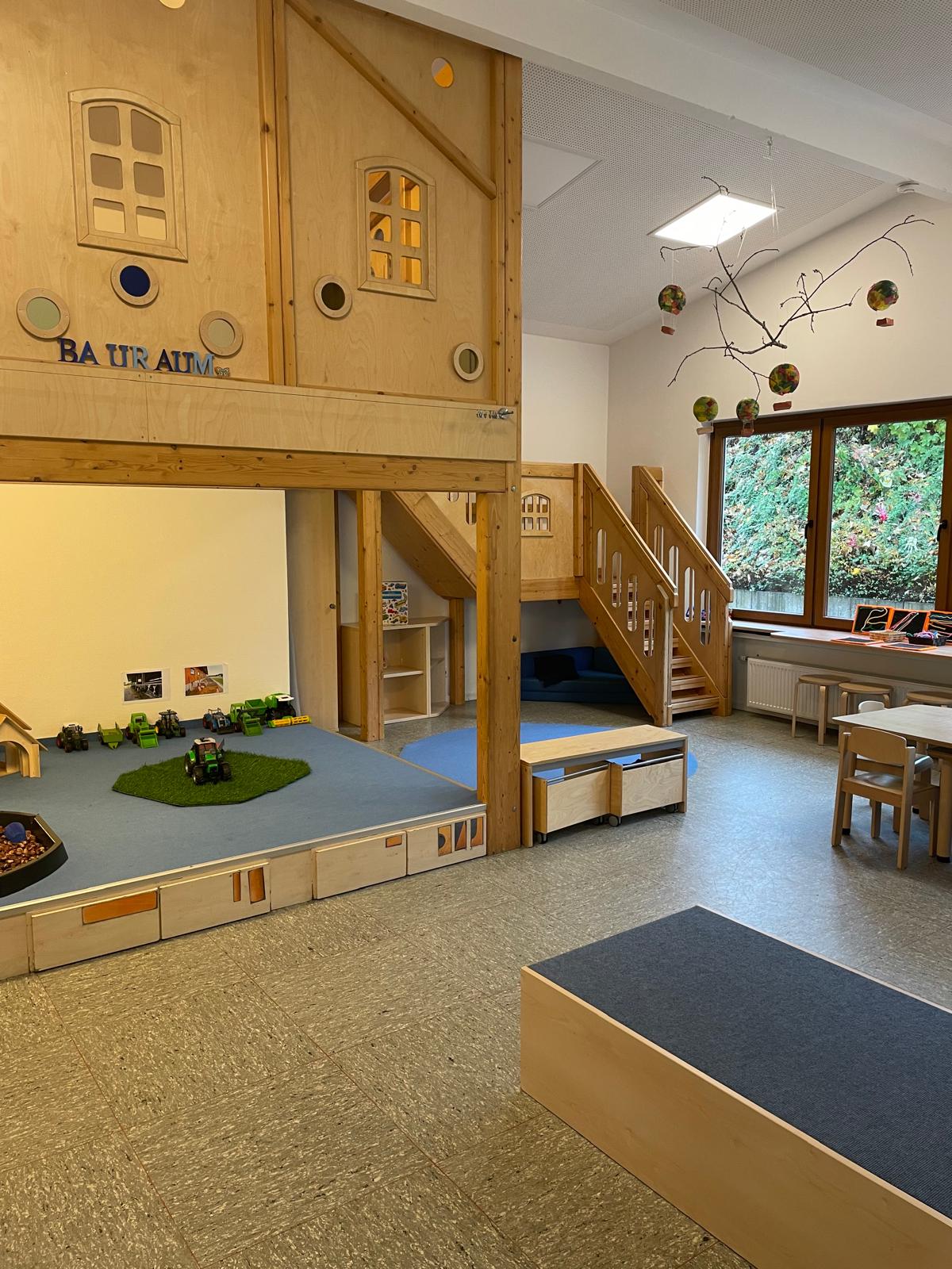 Im Bauraum befinden sich verschiedenste Materialien zum Bauen und Konstruieren, die nach Bedarf und Interessen der Kinder ausgetauscht werden. Der Bauraum unterteilt sich in unterschiedliche Konstruktionsbereiche, die mit Teppichen und Podesten ausgestattet sind.